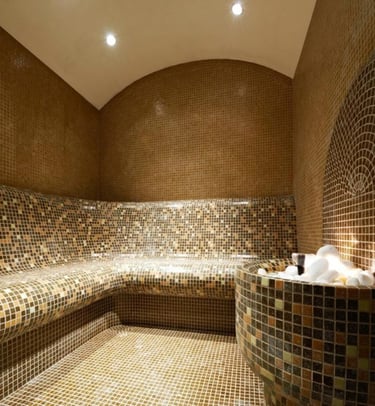 Voyagez au coeur de l'Orient, en découvrant le rituel authentique du Hammam traditionnel, avec son de bain de vapeur régénérant, aux effluves d'eucalyptus, suivi d'un gommage au savon noir, avec le gant de kessa.